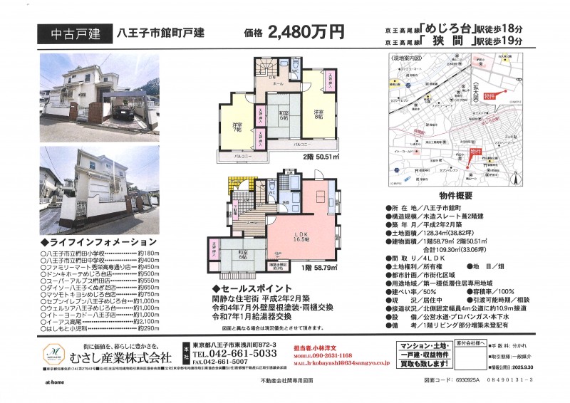 ■閑静な住宅街 ■住環境良好 ■平成2年2月築 ■間取り4LDK ■令和4年7月外壁屋根塗装・雨樋交換 ■令和7年1月給湯器交換 ライフインフォメーション 八王子市立椚田小学校・・・約180m 八王子市立椚田中学校・・・約400m ファミリーマート秀栄高専通り店・・・約450m ドン・キホーテめじろ台店・・・約500m スーパーアルプス椚田店・・・約550m ダイソー八王子くぬぎだ店・・・約650m マツモトキヨシめじろ台店・・・約750m セブンイレブン八王子めじろ台・・・約1,000m ウェルシア八王子めじろ台・・・約1,000m イトーヨーカドー八王子店・・・約1,000m イーアス高尾・・・約2,100m はしもと小児科・・・約290m