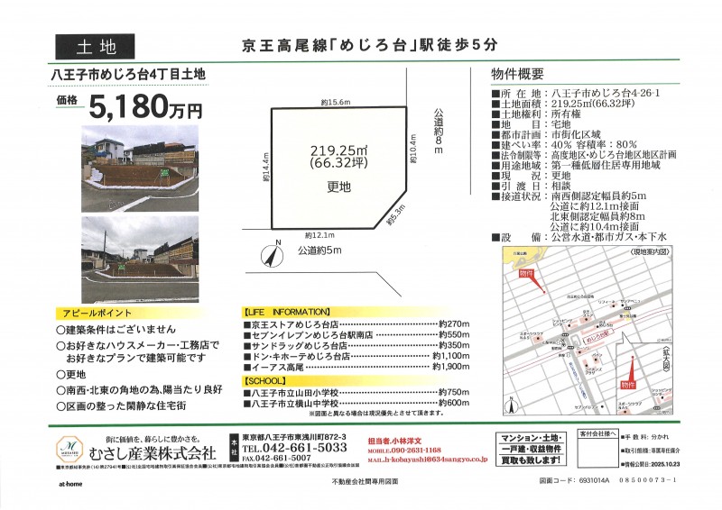 ■建築条件はございません ■土地面積65.24坪 ■閑静な住宅街 ■区画が整った分譲地 ■整形地 ■陽当たり良好 ライフインフォメーション ・京王ストアめじろ台店・・・約300m ・サンドラッグ・・・約500m ・めじろ台店駅前郵便局・・・約400m